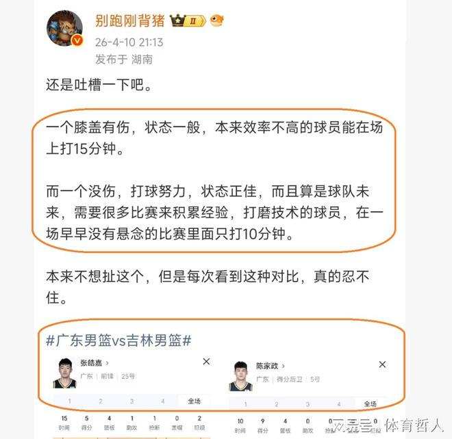 然而,杜锋的这番话,却遭到了CBA记者“别跑刚背猪”的质疑,他认为杜锋在用人方面,有大问题,受伤的球员,打得一般,效率不高的张皓嘉,在场上打了15分钟。反观,没有伤病,而且,打球十分努力,状态也是十分不错的陈家政,却只打了10分钟,这样的情况,明显是存在问题。