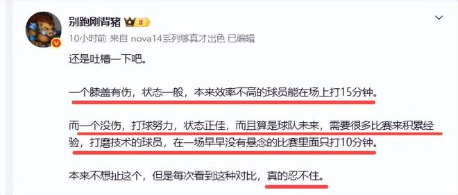 他说“还是吐槽一下吧。一个膝盖有伤,状态一般,本来效率不高的球员能在场上打15分钟。而一个没伤,打球努力,状态正佳,而且算是球队未来,需要很多比赛来积累经验,打磨技术的球员,在一场早早没有悬念的比赛里面只打10分钟。本来不想扯这个,但是每次看到这种对比,真的忍不住”。其实别跑刚背猪是拿有伤的张皓嘉与没伤状态好的陈家政作出对比,张皓嘉打了近15分钟只得5分,而只打10分钟的陈家政得了9分,谁的表现好谁的效率高,不是一目了然吗?你杜锋就是作妖,别在这里扯什么困难了,正像球迷怒喷的那样,你就是困难的最大制造机!诸位,你们认同这个观点吗?